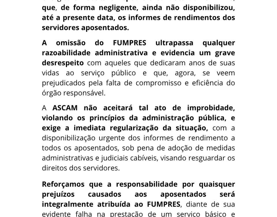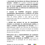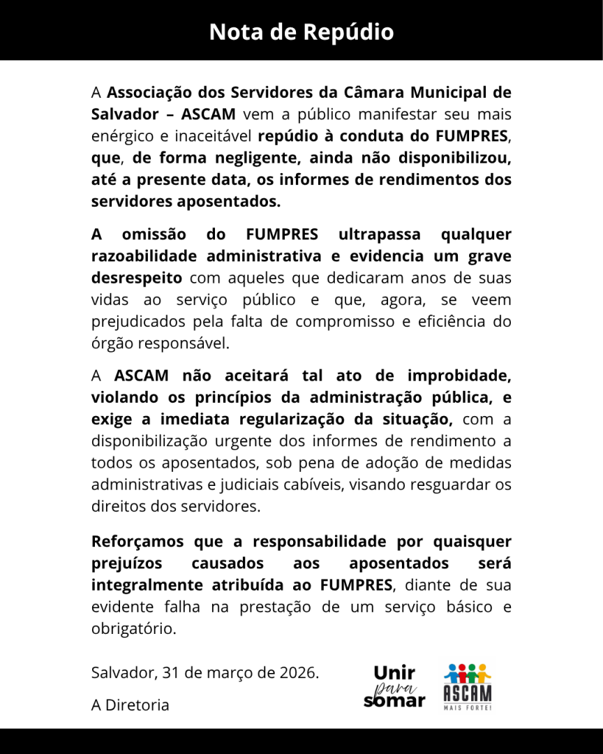 A Associação dos Servidores da Câmara Municipal de Salvador – ASCAM vem a público manifestar seu mais enérgico e inaceitável repúdio à conduta do FUMPRES, que, […]